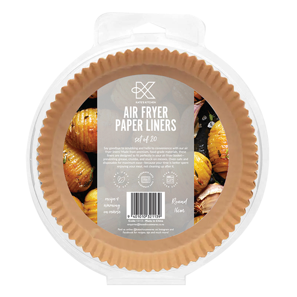 Spend less time cleaning up with Kate’s Air Fryer Liners! Designed to fit perfectly in your air fryer basket, these liners prevent grease, crumbs, and stuck-on messes. Crafted from durable, food-safe paper, they’re heat-resistant and ideal for all your favourite air-fried recipes. Available in convenient packs of 20. Perfect for everyday cooking, they help keep your air fryer looking like new while saving you time in the kitchen!
