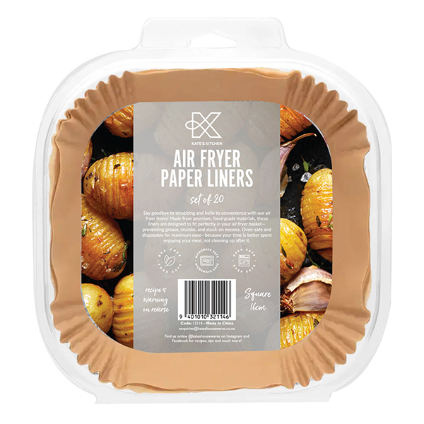 Spend less time cleaning up with Kate’s Air Fryer Liners! Designed to fit perfectly in your air fryer basket, these liners prevent grease, crumbs, and stuck-on messes. Crafted from durable, food-safe paper, they’re heat-resistant and ideal for all your favourite air-fried recipes. Available in convenient packs of 20. Perfect for everyday cooking, they help keep your air fryer looking like new while saving you time in the kitchen!