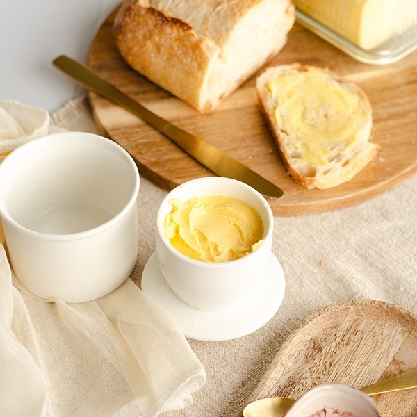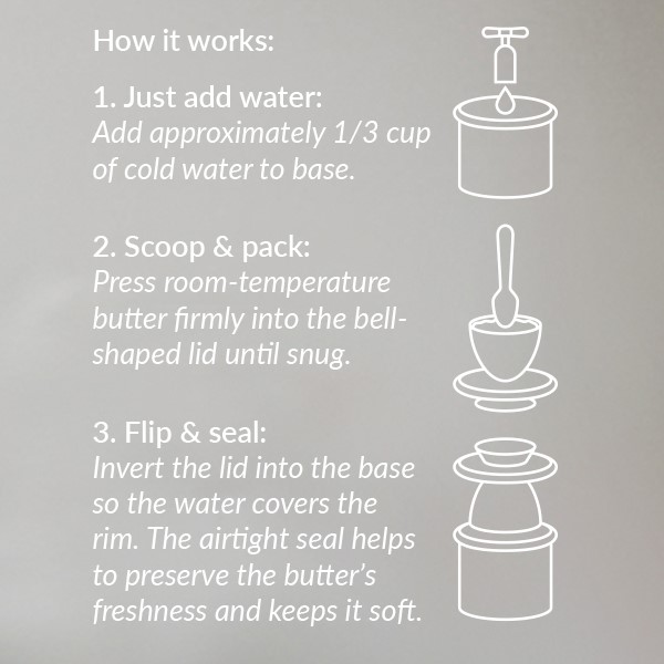 Just pour 1/3 cup of cold water into the base, then scoop and pack room-temperature butter snugly into the bell-shaped lid. Flip it over and seal it into the base so the water gently hugs the rim, making sure to keep the water changed out every 2-3 days. That clever little water seal keeps air out and freshness in—so your butter stays soft, tasty, and ready to spread at a moment’s notice.